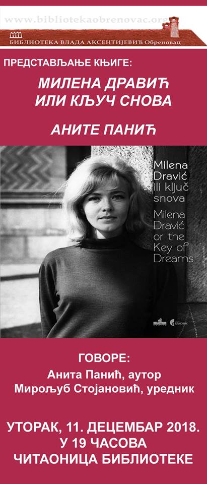 У уторак, 11. децембра 2018. године у читаноци Библиотеке “Влада Аксентијевић“ од 19.00 часова биће представљена књига “Милена Дравић или кључ снова“, приређивача и аутора Аните Панић, објављене у суиздаваштву Филмског центра Србије и Службеног гласника.