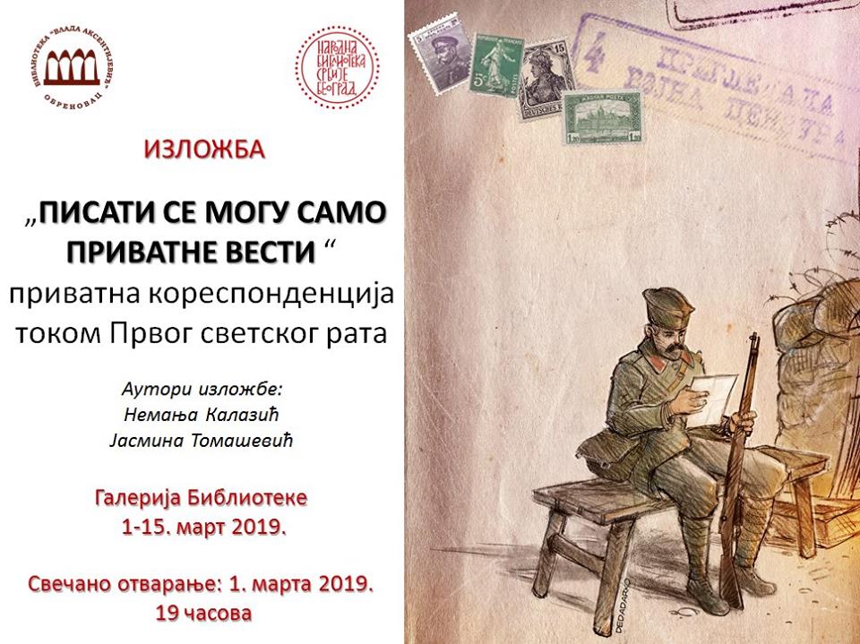 У галерији Библиотеке “Влада Аксентијевић“ од 1. до 15. марта 2019. године биће постављена изложба “Писати се могу само приватне вести“: приватна кореспонденција током Првог светског рата.