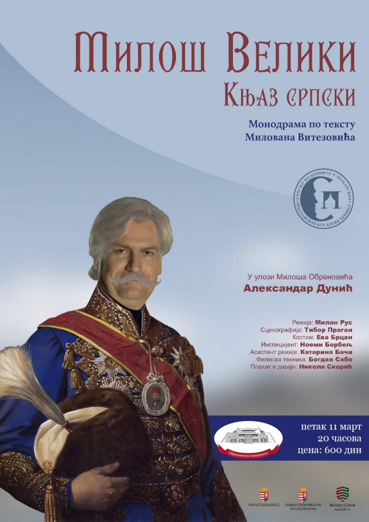 Глумац Позоришта на Теразијама Александар Дунић извешће монодраму “Милош Велики – Књаз српски“ у петак, 11. марта у малој позоришној сали Дома културе са почетком у 20.00 сати.
