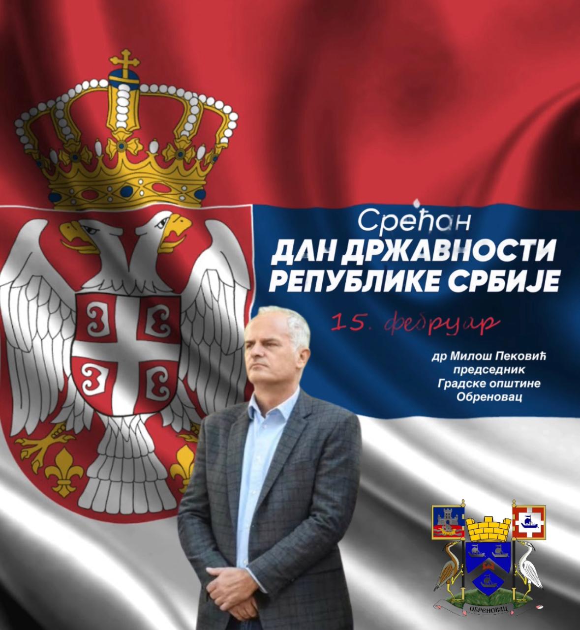 Председник Градске општине Обреновац, др Милош Пековић, упутио је честитку грађанима поводом Дана државности Републике Србије.