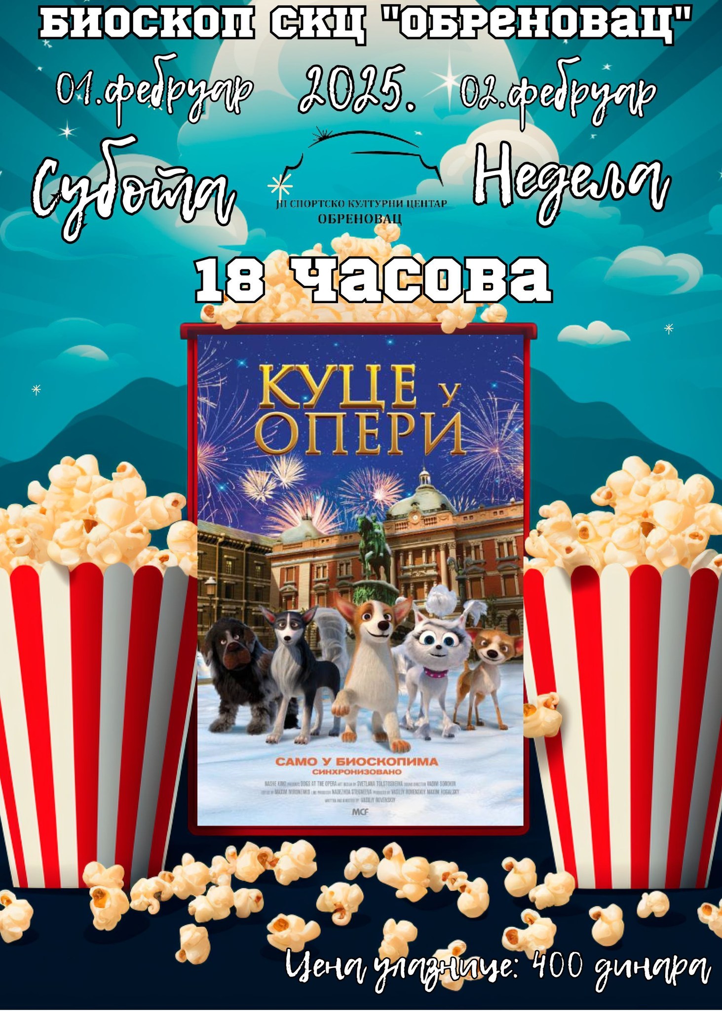 Филм за децу ”Куце у опери” биће приказан у биоскопској сали Спортско-културног центра ”Обреновац у суботу, 1. и у недељу, 2. фебруара са почетком у 18.00 сати.