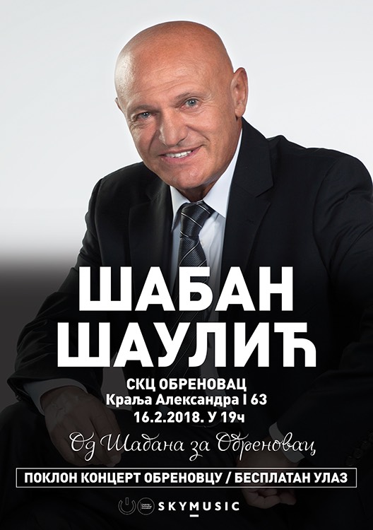 Skymusic у сарадњи са Шабаном Шаулићем, поклања грађанима општине Обреновац концерт. Концерт ће се одржати у петак, 16. фебруара са почетком у 19.00 часова у спорској хали СКЦ “Обреновац“. Улаз бесплатан.