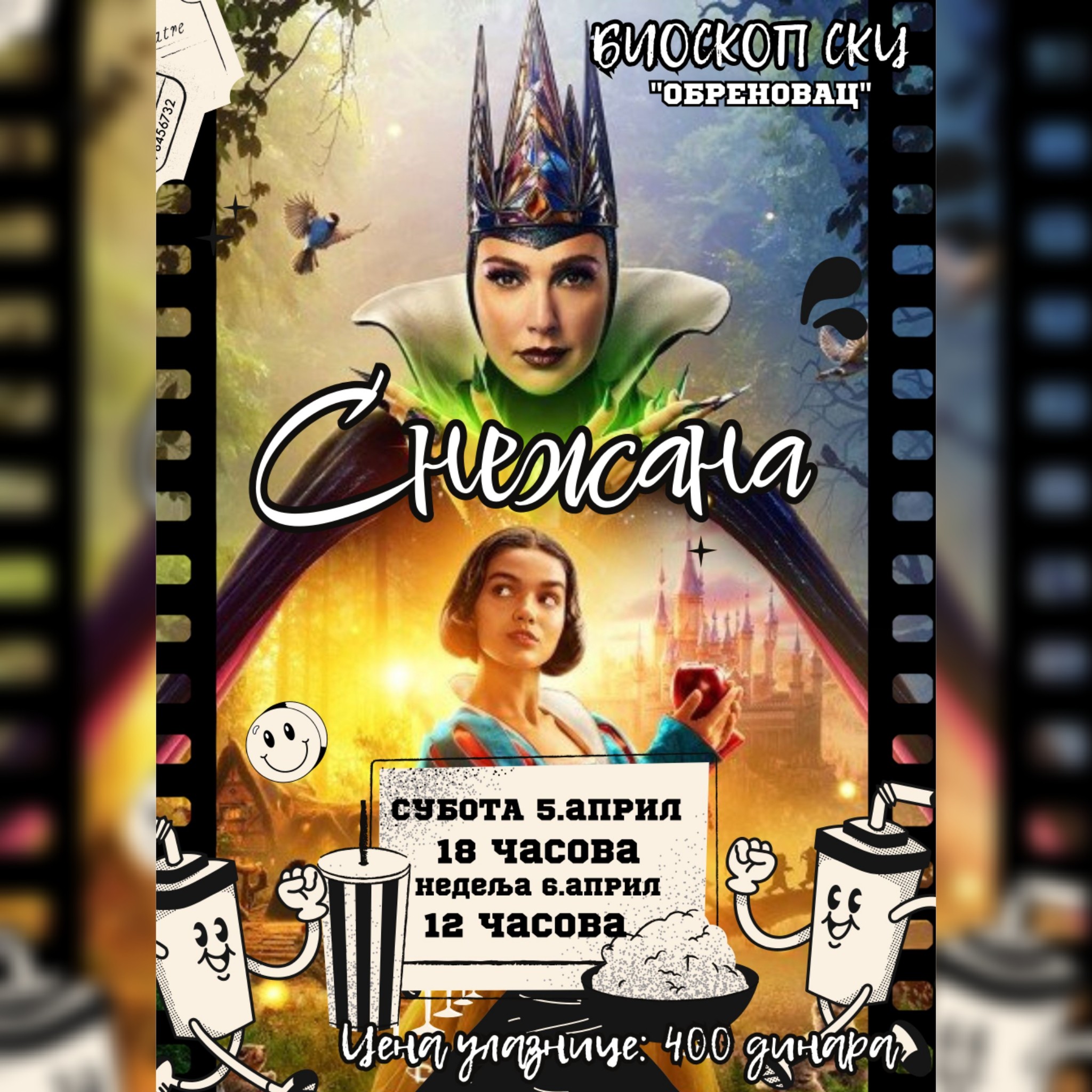 Film za decu “Snežana“ biće prikazan u bioskopskoj sali Sportsko-kulturnog centra “Obrenovac“ u subotu, 5. aprila od 18.00 sati i u nedelju, 6. aprila od 12.00 sati.