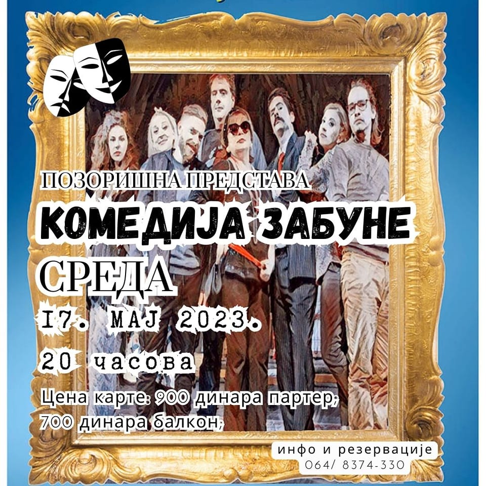 Pozorišna predstava “Komedija zabune“ biće odigrana u velikoj pozorišnoj sali Sportsko-kulturnog centra “Obrenovac“ u sredu, 17. maja sa početkom u 20.00 sati.