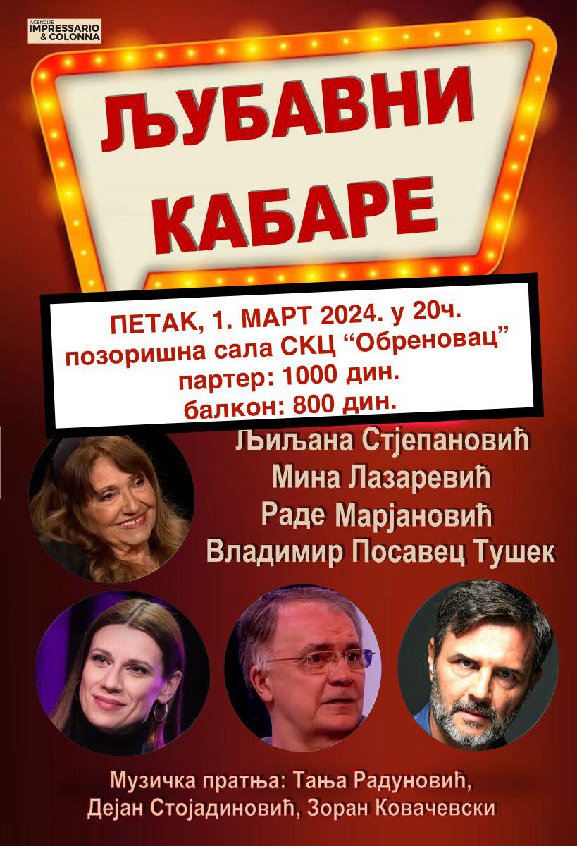 Позоришна представа “Љубавни кабаре“ биће одиграна на великој позоришној сцени Спортско-културног центра “Обреновац“ у петак, 1. марта са почетком у 20.00 сати.