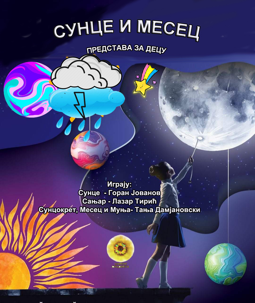 У јединственој плесној представи „Сунце и Месец“ кроз различите улоге глумаца (Сунцокрет, Сунце, Месец, Сањар и Муња) деца се упознају са различитим атмосферским појавама, као и са невероватним променама, које се дешавају на планети Земљи због њиховог међусобног деловања. Представа обилује оригиналним плесним кореографијама и едукативним порукама.