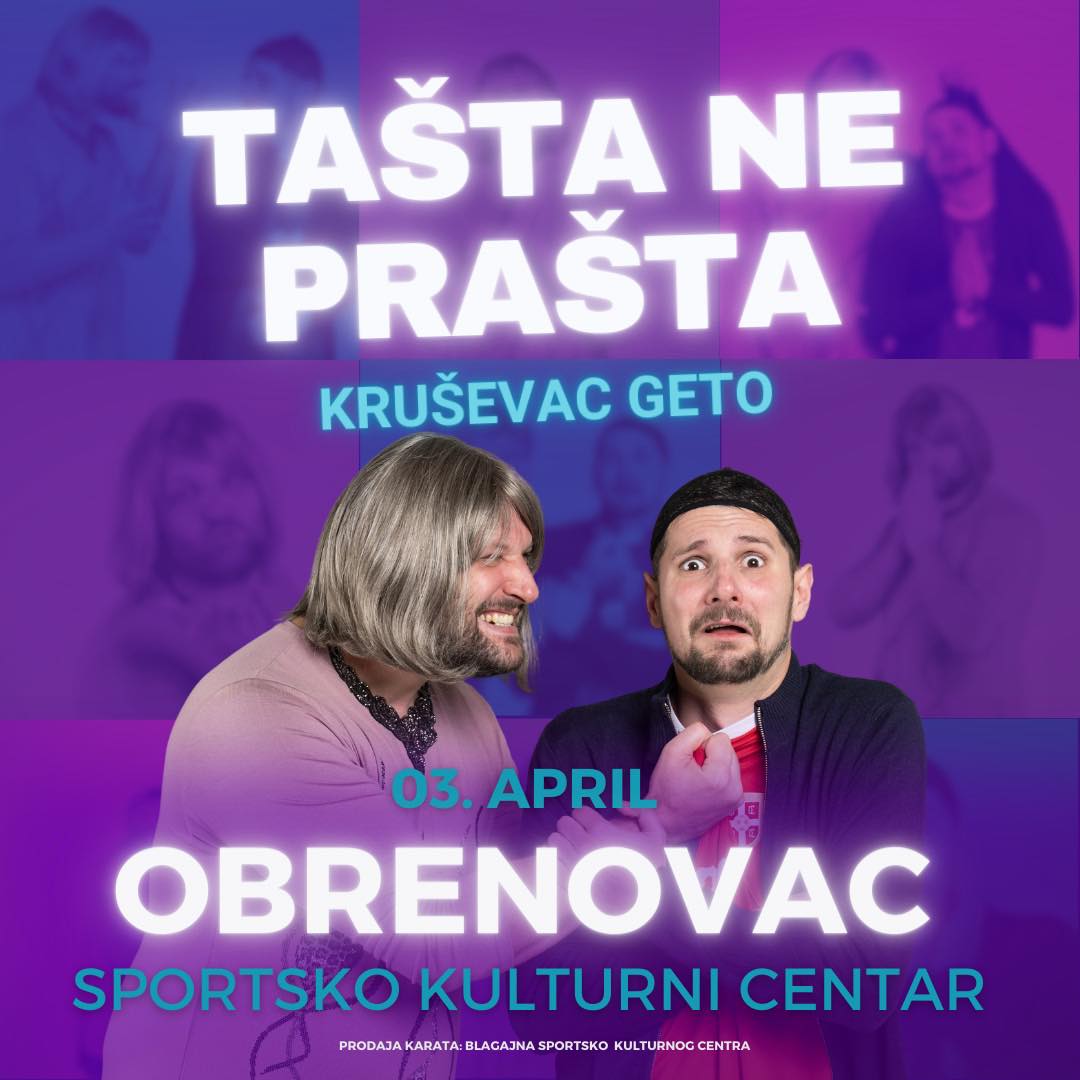 На великој позоришној сцени Спортско-културног центра “Обреновац“ у среду, 3. априла са почетком у 20.00 сати биће одиграна представа “Ташта не прашта“ у извођењу састава “Крушевац Гето“.