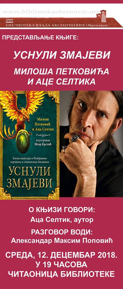 У среду, 12. децембра 2018. године у читаоници Библиотеке “Влада Аксентијевић“ од 19.00 часова биће представљена књига “Уснули змајеви“ аутора Милоша Петковића и Аце Селтика.