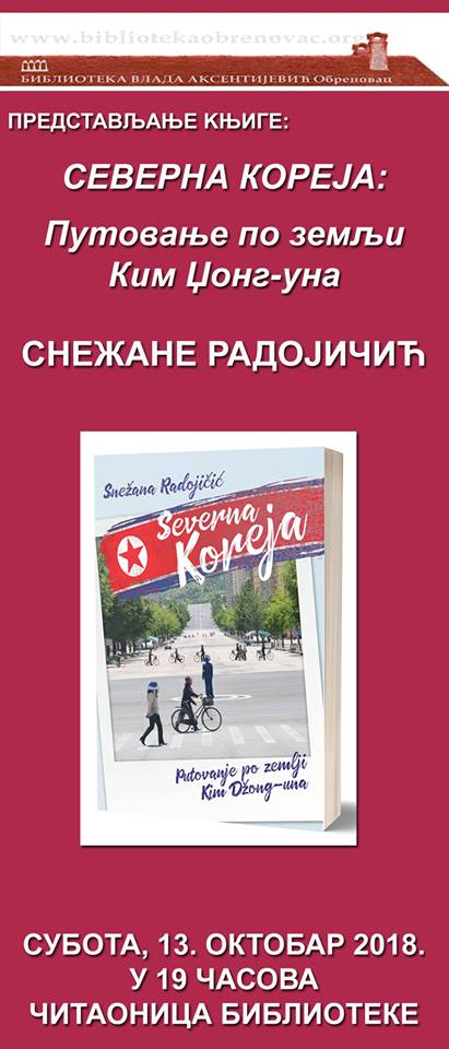 Путописно предавање о Северној Кореји и промоција књиге “Северна Кореја – путовање по земљи Ким Џонг Уна“ Снежане Радојичић биће одржани у суботу, 13. октобра у 19.00 часова у читаоници Библиотеке “Влада Аксентијевић“.