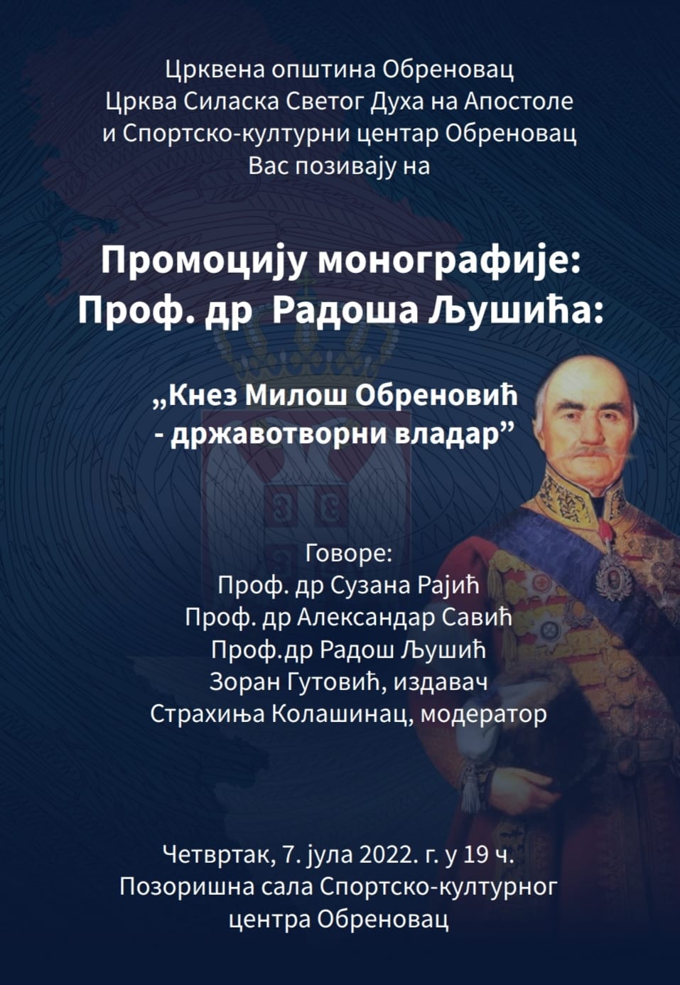 У позоришној сали Спортско-културног центра “Обреновац“ у четвртак, 7. јула са почетком у 19.00 сати, биће одржана промоција монографије професора др Радоша Љушића, “Кнез Милош Обреновић – државотворни владар“.