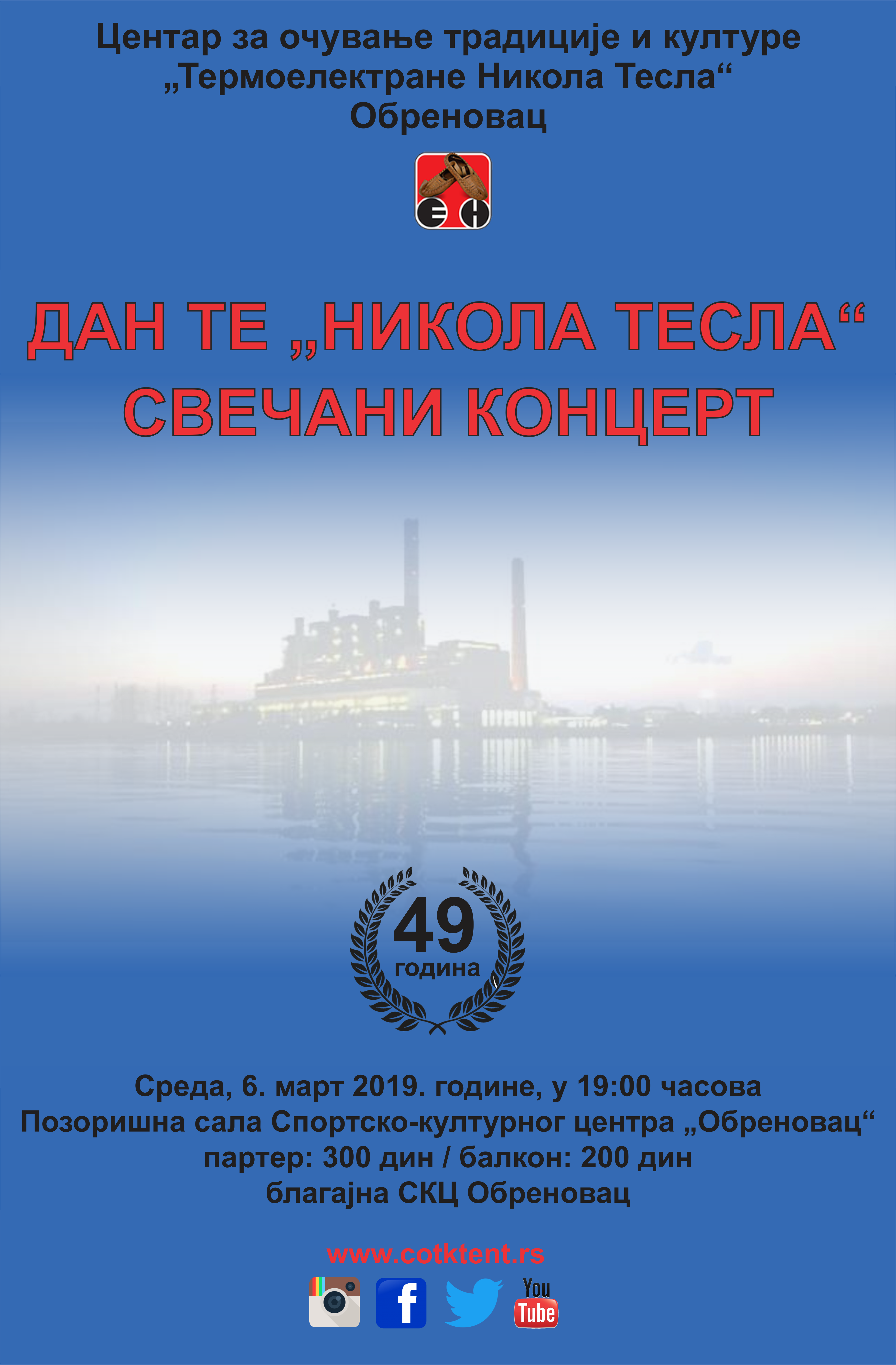 Традиционална Свечана академија поводом прославе 49 година успешног постојања и рада Термоелектране “Никола Тесла“ Обреновац, биће уприличена у среду, 6. марта 2019. године, с почетком у 19.00 часова у позоришној сали Спортско-културног центра “Обреновац“.
