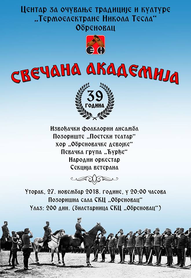 Свечана академија поводом прославе 39 година постојања и рада Центра за очување традиције и културе “Термоелектране Никола Тесла“ Обреновац биће уприличена у уторак, 27. новембра 2018. године, с почетком у 20:00 часова у позоришној сали Спортско-културног центра “Обреновац“.