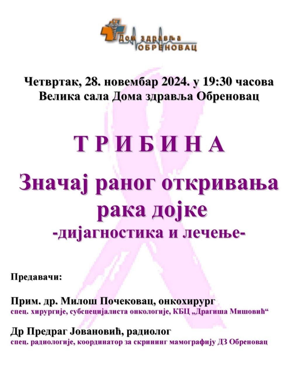 У четвртак, 28. новембра у 19.30 сати у великој сали Дома здравља Обреновац одржаће се трибина на тему Значај раног откривања рака дојке – дијагностика и лечење.