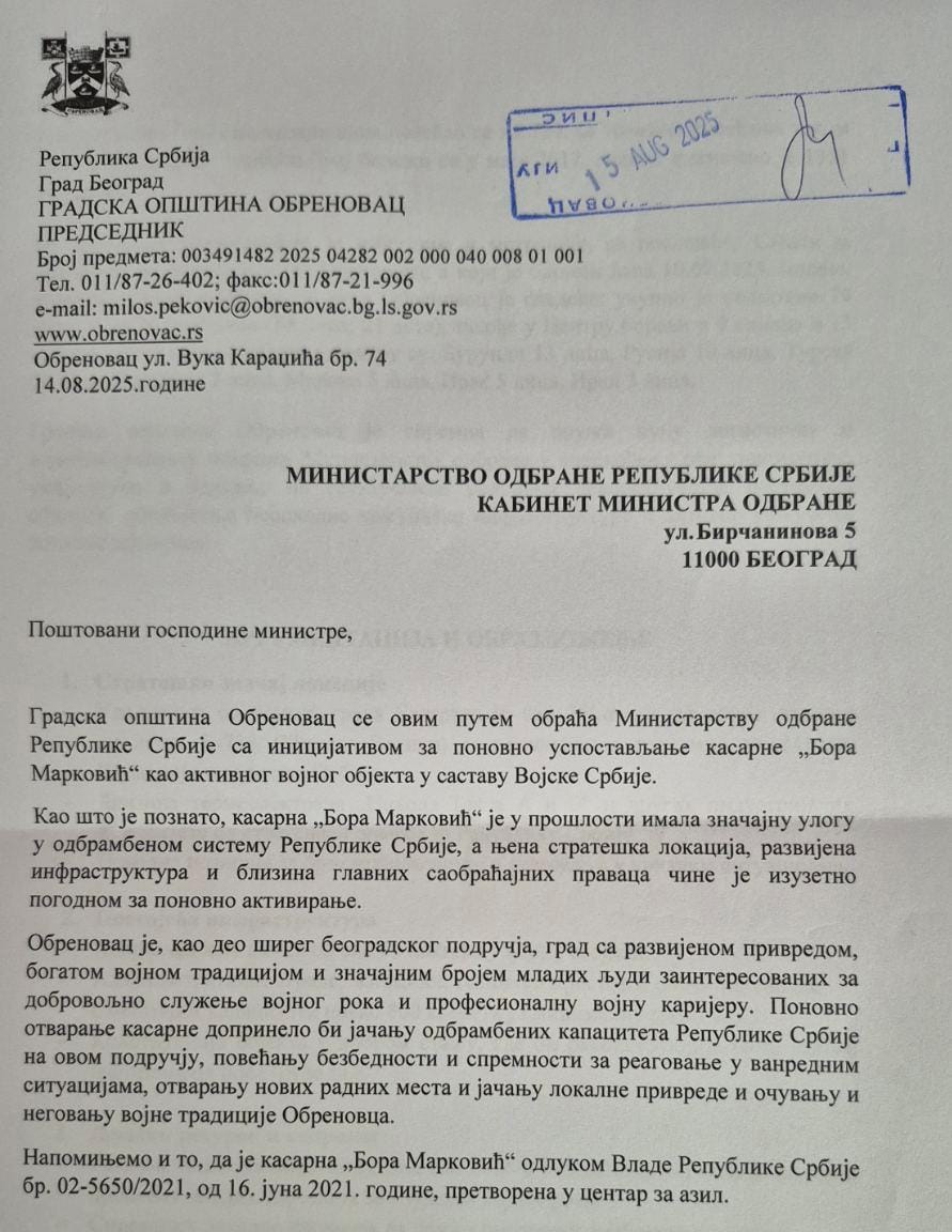 Predsednik gradske opštine Obrenovac, dr Miloš Peković pokrenuo je inicijativu i obratio se Ministarstvu odbrane Republike Srbije za ponovno uspostavljanje kasarne “Bora Marković“ kao aktivnog vojnog objekta u sastavu Vojske Srbije.