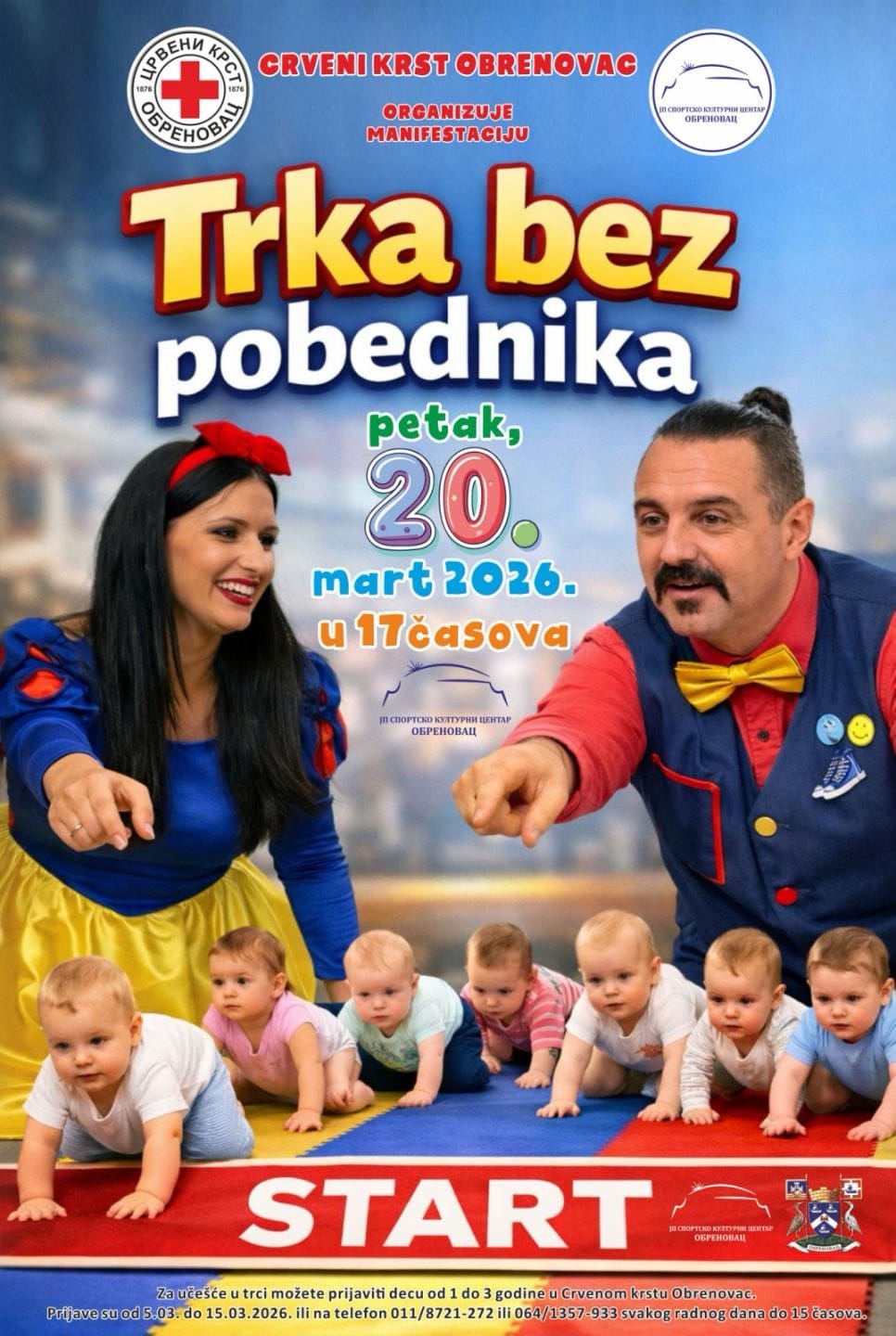 У петак, 20. марта од 17.00 часова биће одржана манифестација „Трка без победника“, у организацији Црвеног крста Обреновац и СКЦ „Обреновац“. За учешће у трци могуће је пријавити децу узраста од 1 до 3 године у Црвеном крсту Обреновац, у периоду од 5. до 15. марта или путем телефона 011/8721-272 и 064/1357-933 сваког радног дана до 15.00 часова.